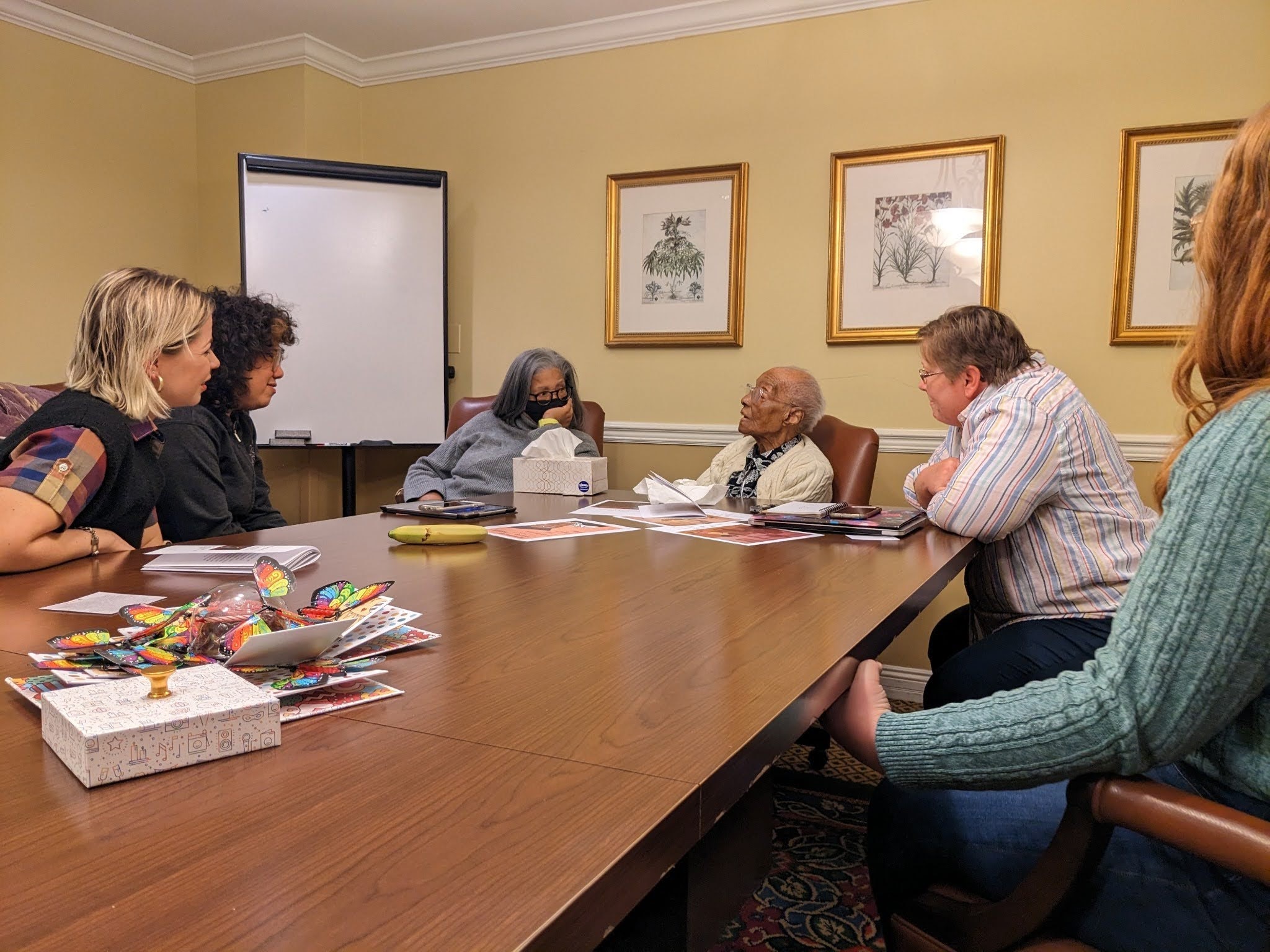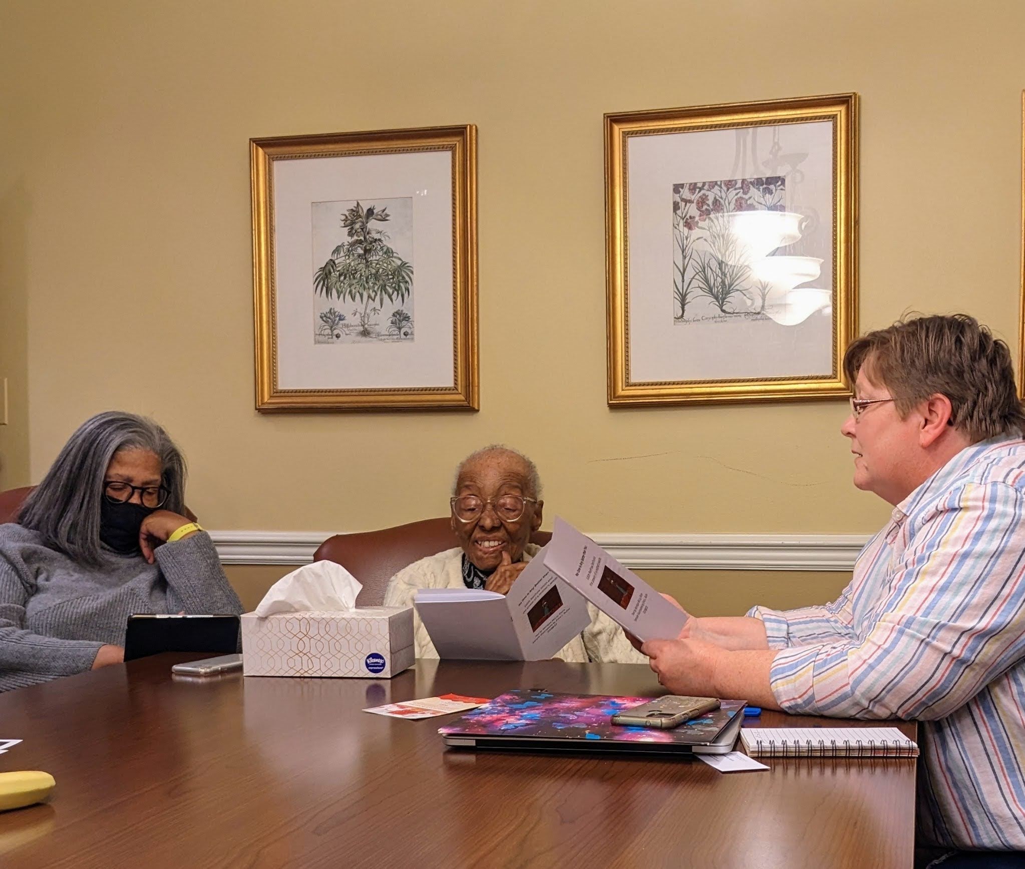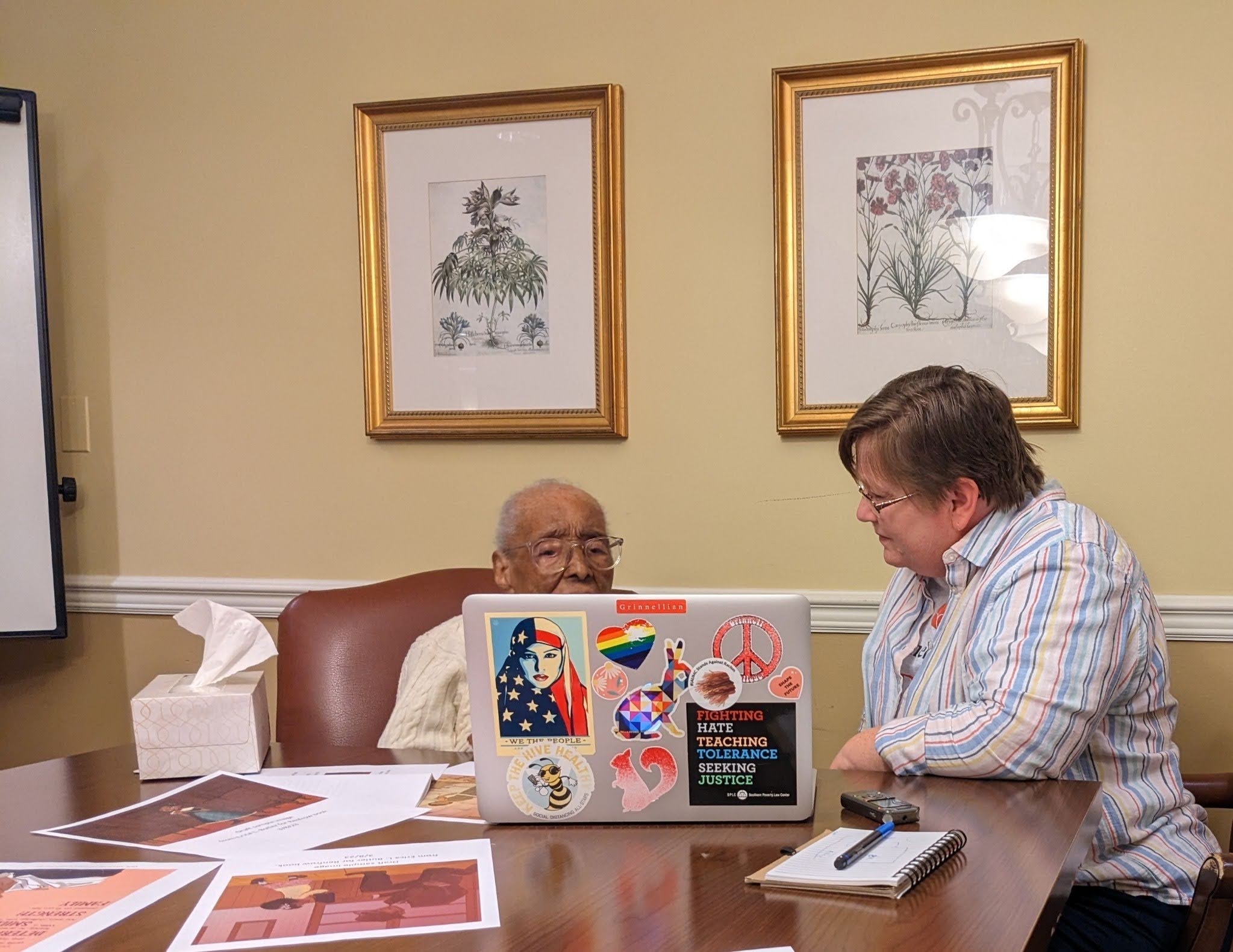 Her daughter Alice had arranged for us to be in a lovely room on the main floor of her retirement community. From the moment they saw the copies of the draft images Erica has done, they started talking up a storm about details for the illustrations. I connected to Erica as quickly as I could so she could meet them (video chat is such wonderful thing!) and hear all they had to share. We talked with her for nearly a full hour, discussing everything from shoes & socks to outhouses!