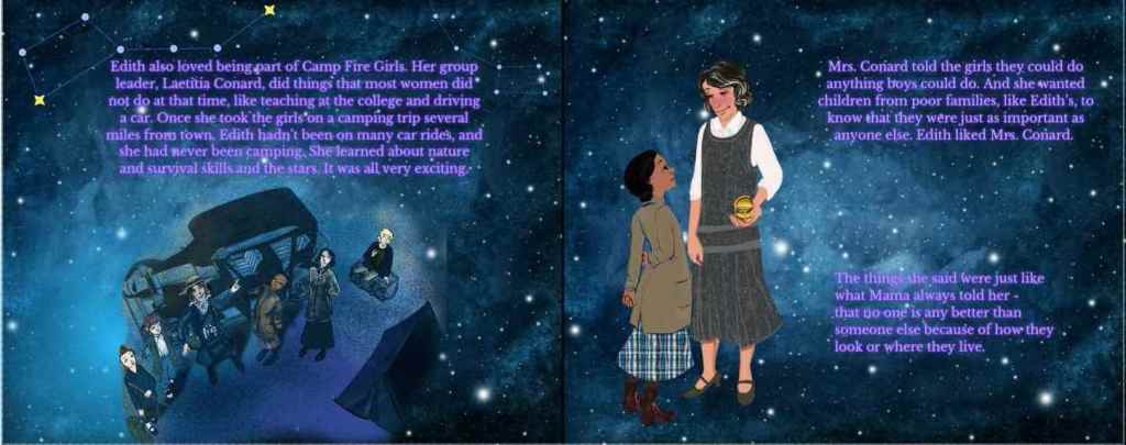 This page is one of my favorite illustrations. I love how Erica used the perspective and the star-filled sky. The other reason I love this page is because it talks about Laetitia Conard, another overlooked amazing women in Grinnell’s history.