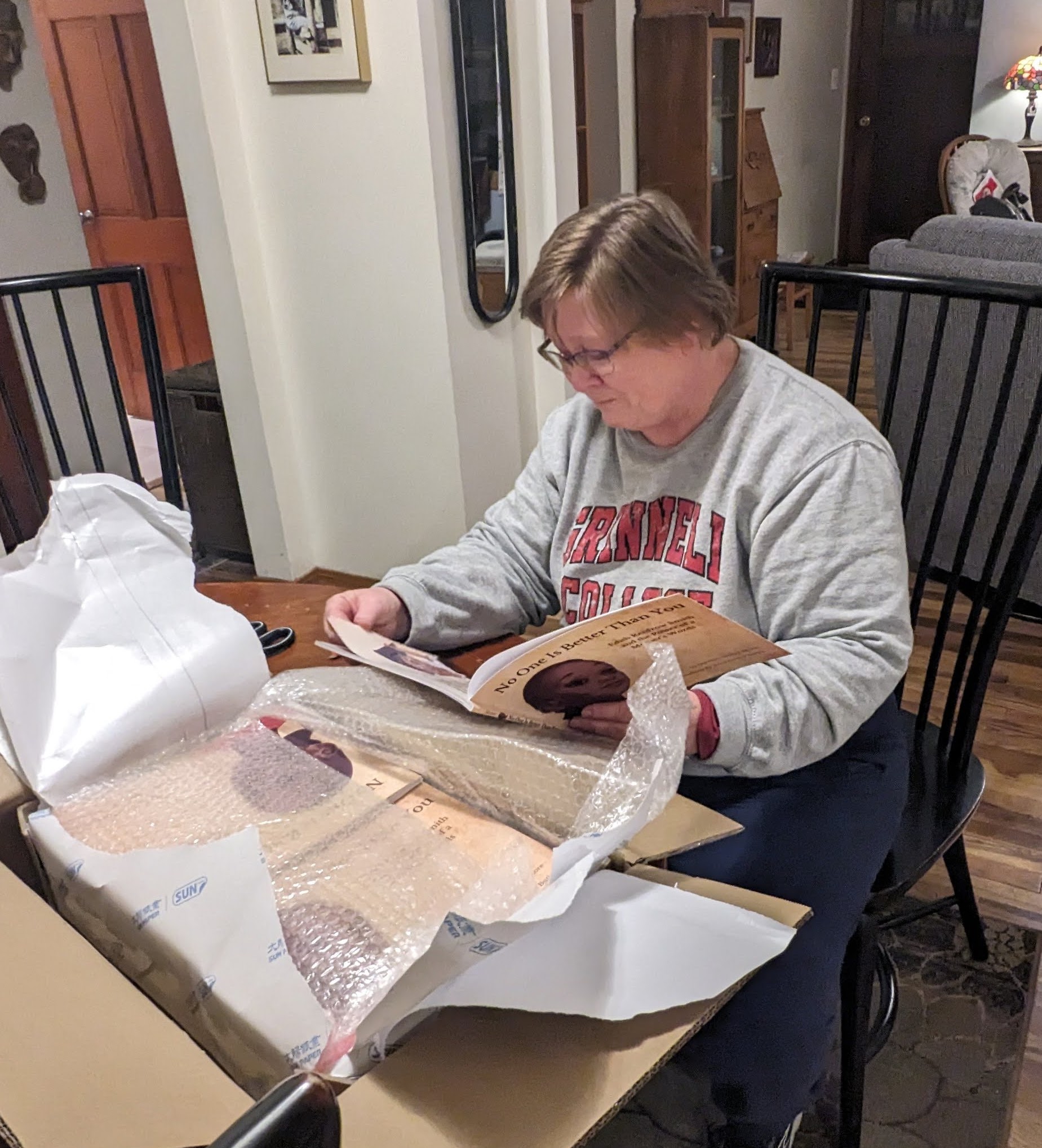 While I was enjoying time with family on Thanksgiving day a UPS delivery alert popped up on my phone to tell me the first copies of the book would be delivered on Friday. I let out a little gasp of joy, mingled with just a hint of disappointment that I wouldn’t be home when they arrived. I sent a text to Tobias, who was taking care of our cat, to let him know to watch for them and give them some TLC. He is a student who works on digital archiving projects with me at the library, so he is well aware of how exciting this moment is. I had him send me a picture once they got there, like an anxious mother wanting to know her baby was safely out of the cold.