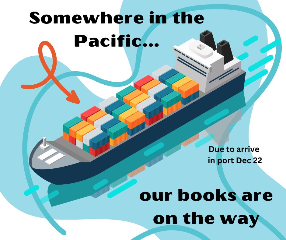 I received an update from Print Ninja. The ship carrying the books is expected to reach port in California around December 22nd. After that, they need to clear customs and be unloaded, sorted, and labeled for final delivery. And, of course, then they have to make their way through the series of steps and vehicles that will get them from the California port to Grinnell, Iowa. And all happening during the holidays.