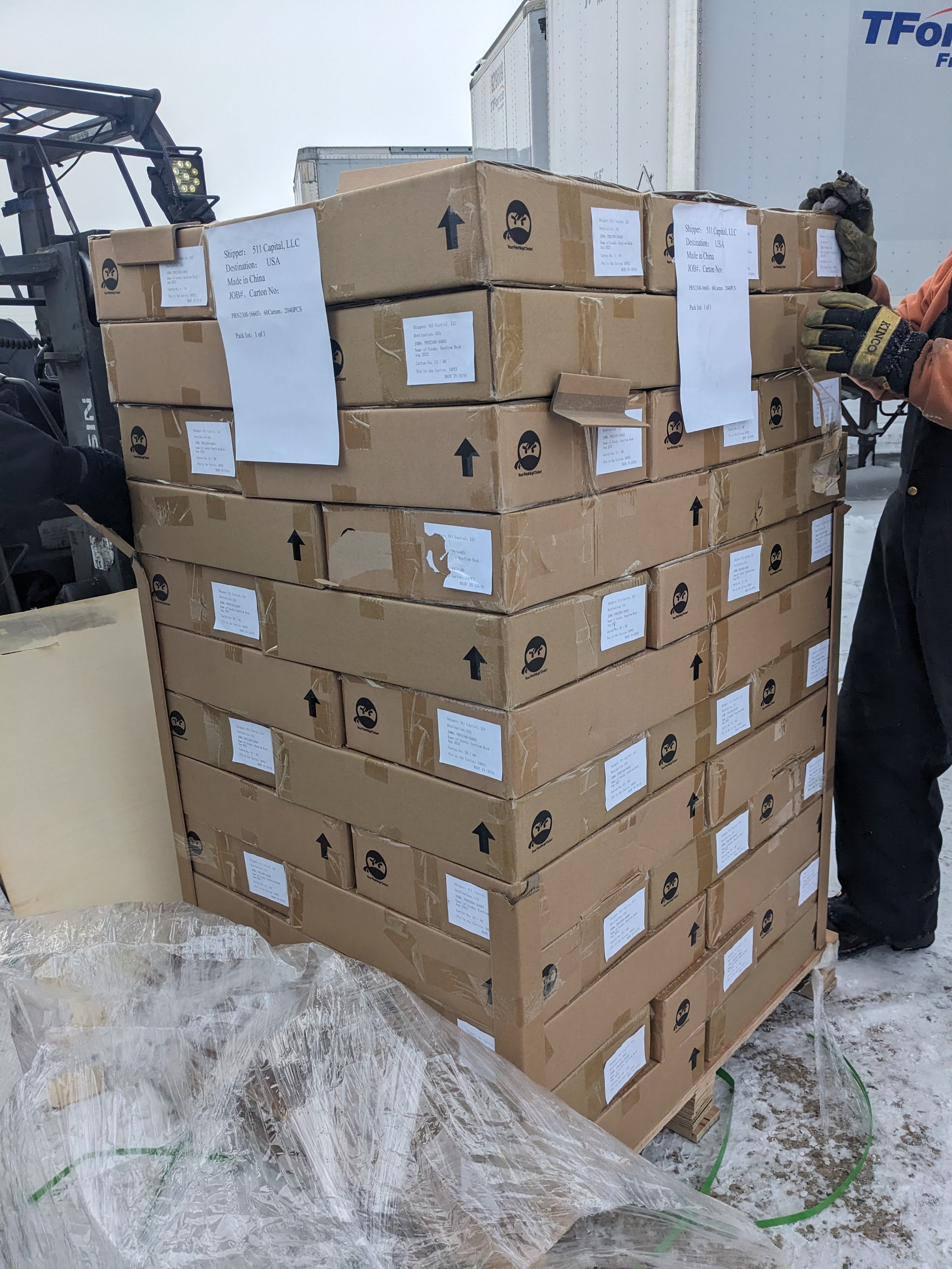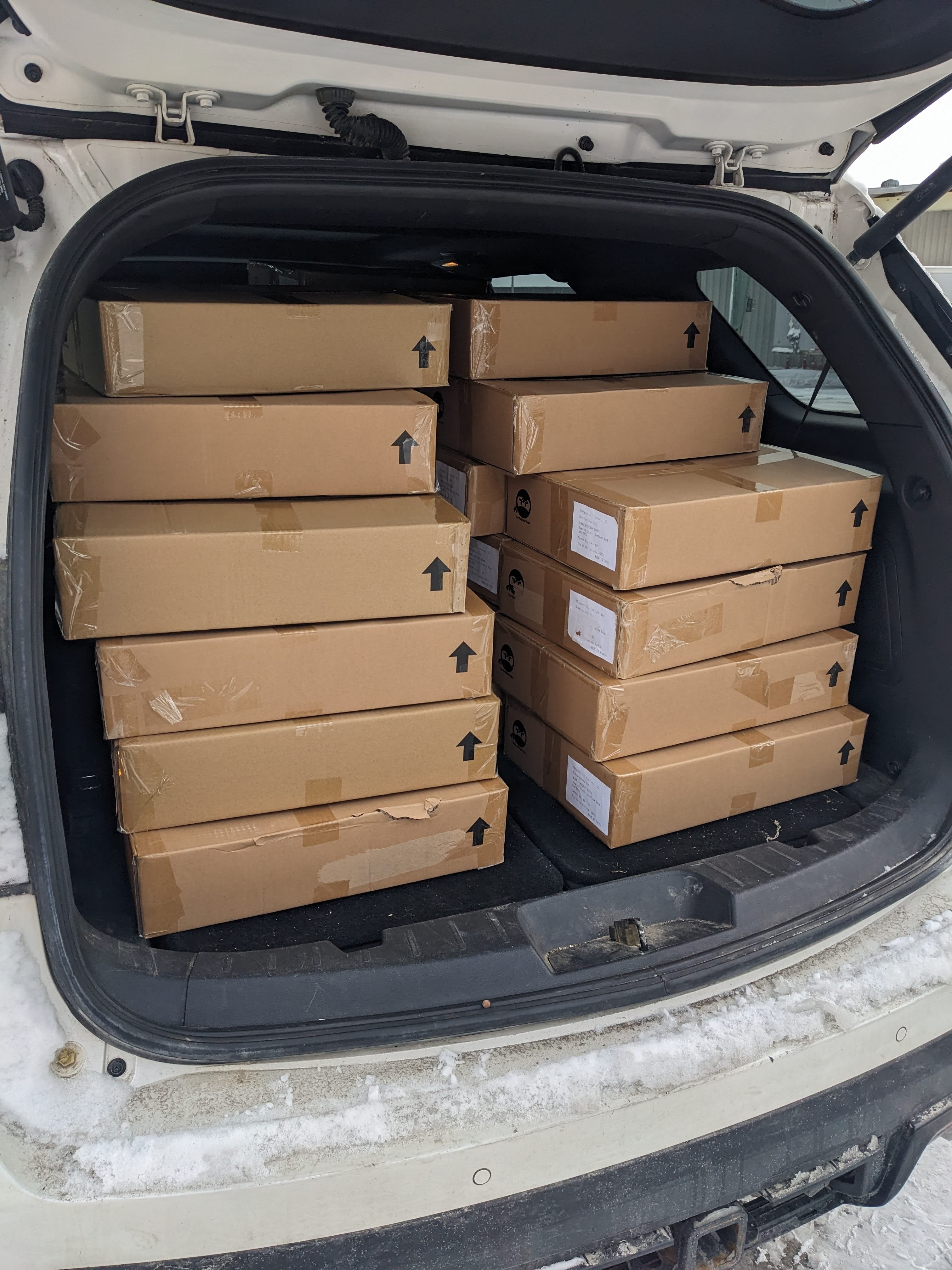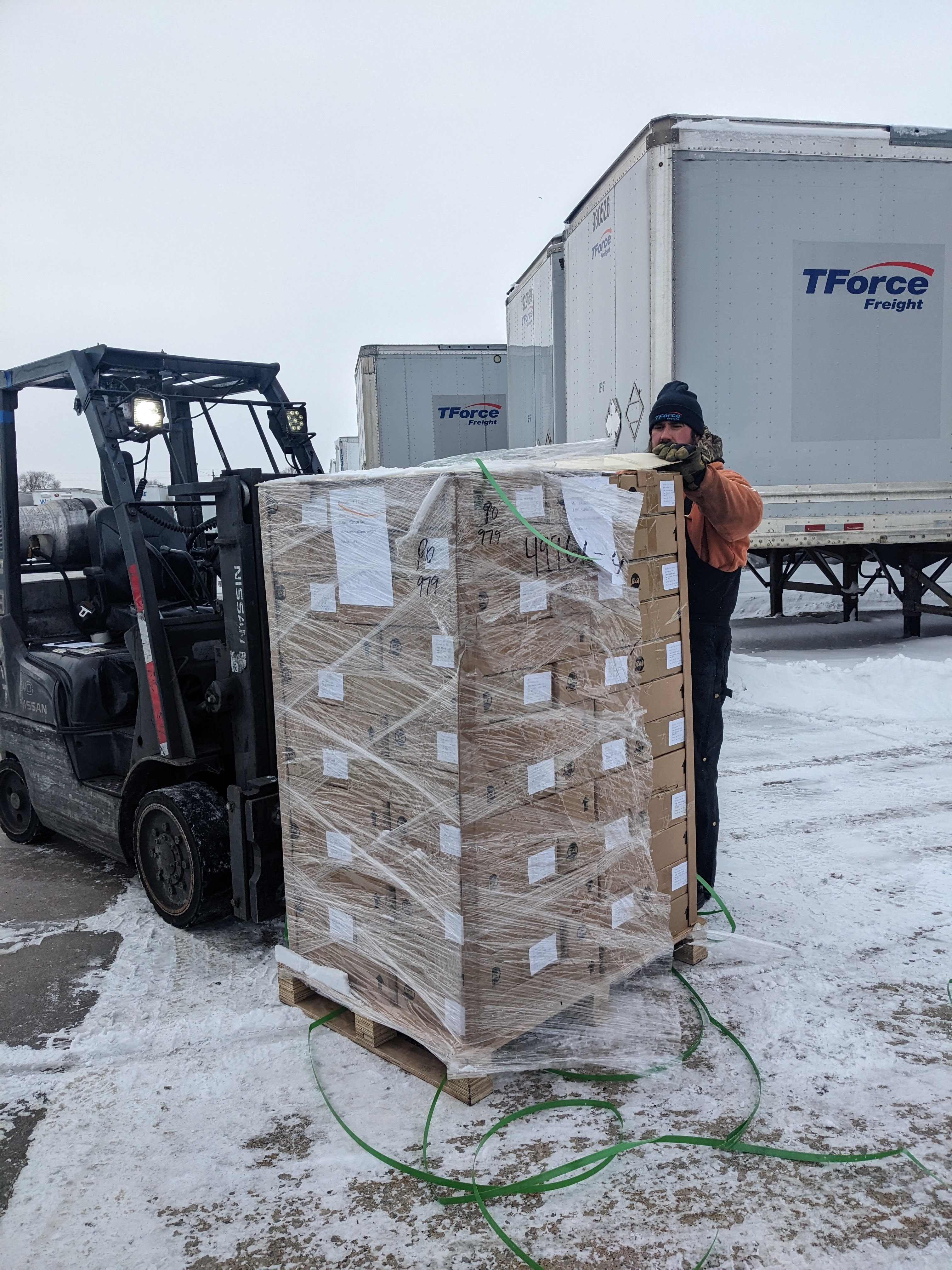 We pulled into the UPS/TForce Freight warehouse at right around 3pm. Their dispatcher had told me to drive through the gate and look for the ramp, park at the bottom, and ring the bell at the door next to the ramp. They’d have our pallet ready to bring down to the parking lot. Sure enough, it was just that easy. And now I can say I’ve picked up a freight delivery from the warehouse. The forklift driver was super nice and very strong and helped us load the boxes into the car. We put our Tetris packing skills to use and were able to get everything in the one load. It’s possible we would have been able to squeeze in one more box. But any more than that might have had to ride on my lap! It was about 15 minutes from the time we saw the pallet to when we were pulling out with our load – and with great big smiles!