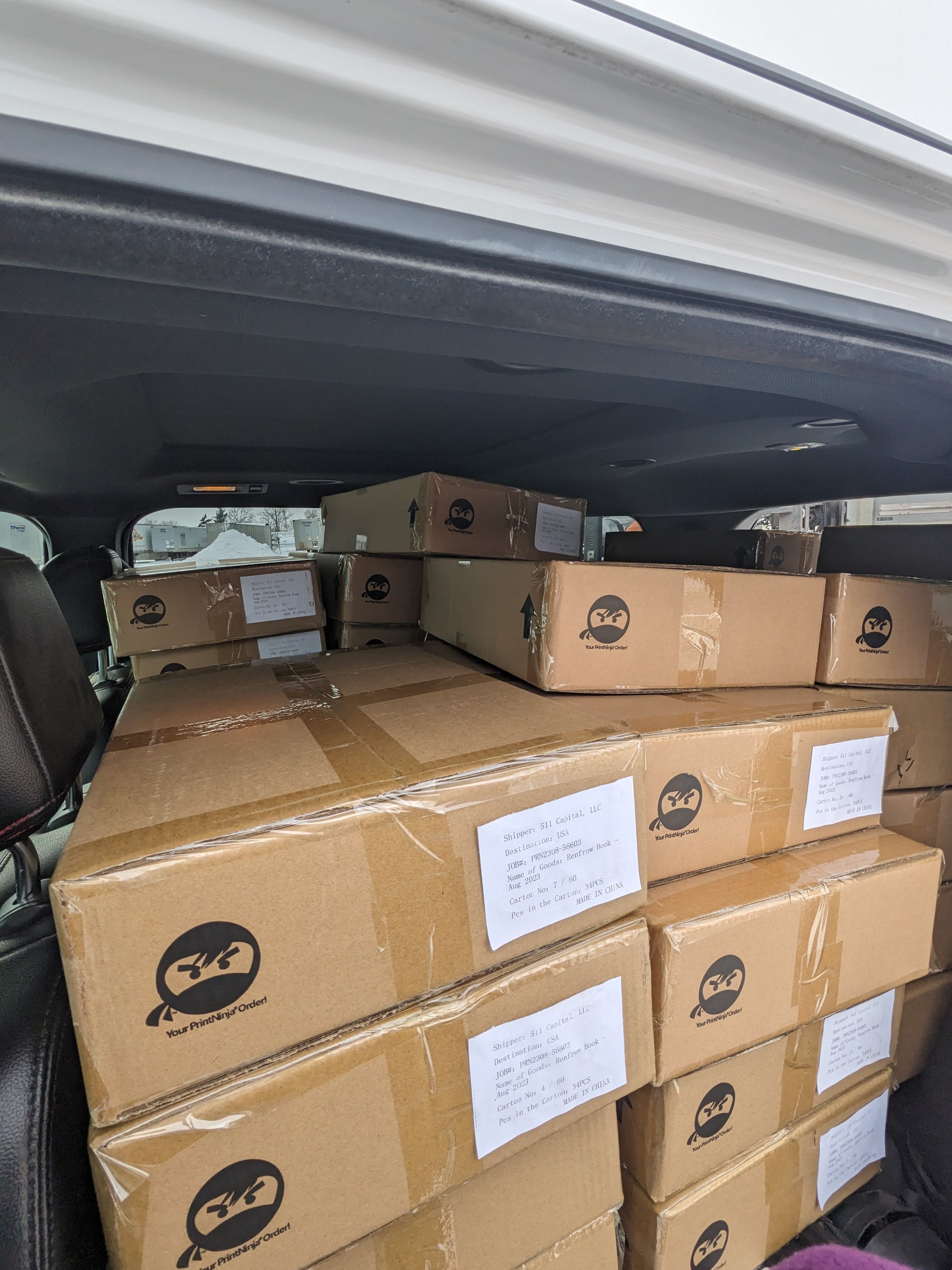 I was not going to give up. This was the day these books would come to Grinnell. I could feel that this was the day. I looked out the window at the sun shining on all that snow. Sure, it was stupid cold, but the sun was shining. There was no wind. And the road condition website said the Interstate was in good shape, i.e. no longer covered by snow but still be careful of the stupid cold. The books were an hour away sitting in a warehouse. Could we go get them? The shipping notice said it was 760 lbs of books. Based on the packaging of the advance copies I new there would be 34 books per box, so about 60 boxes. Would that fit in the back of our Ford Explorer? It would be close. Maybe we could take both of our cars just in case it didn’t all fit. My husband, Craig, and I both had the afternoon set aside for book delivery. A quick call with him to check my sanity (he’s so good to me) and we had a plan. I’d work until 1pm and then we’d hit the road.