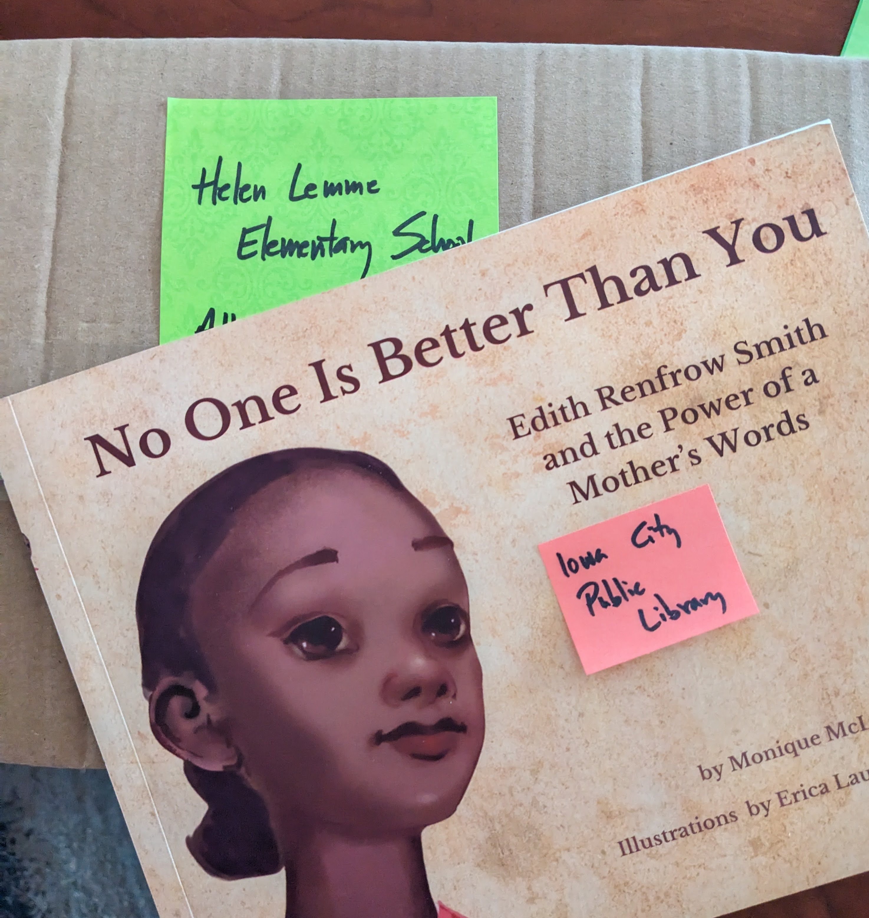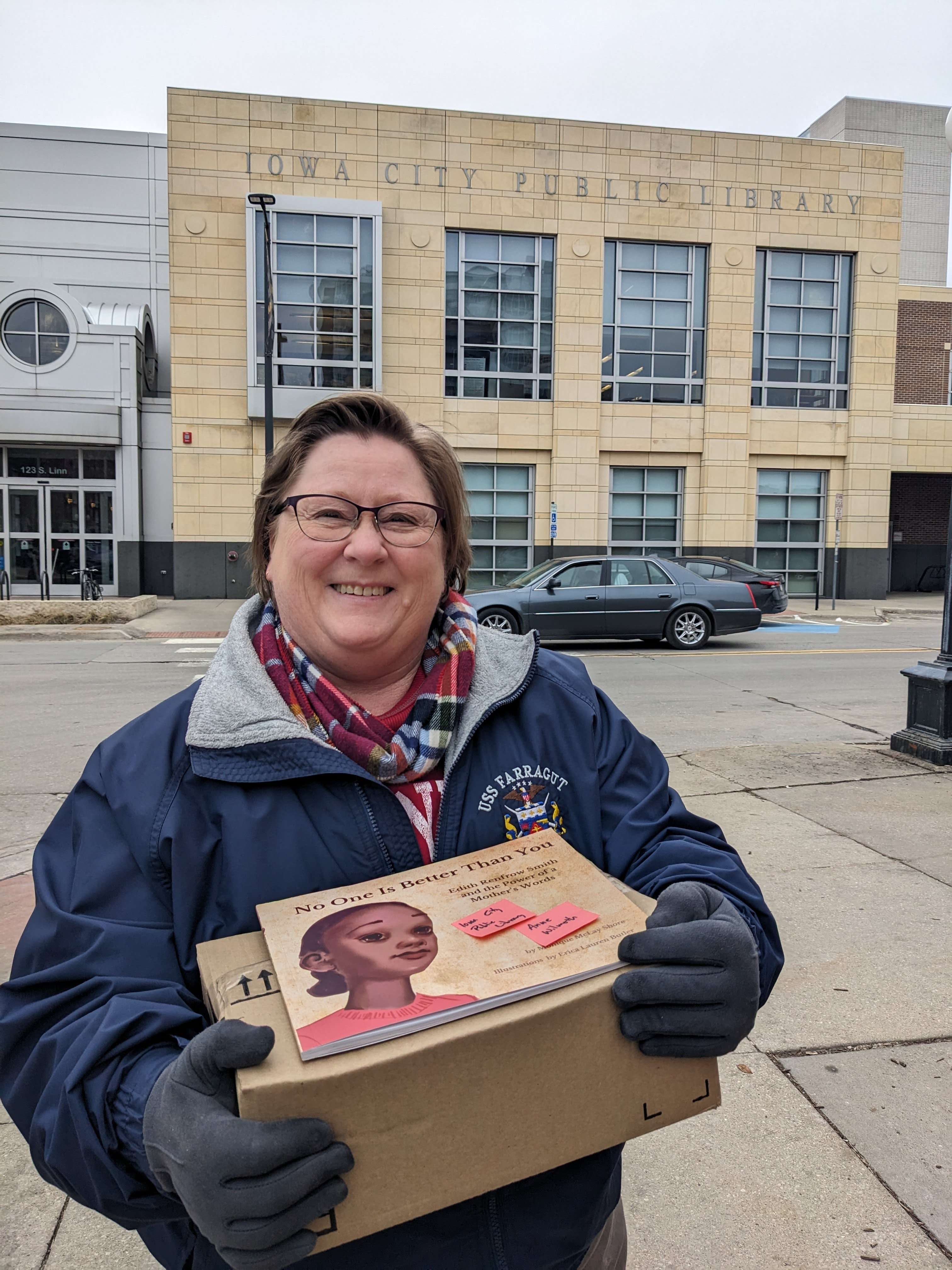 I had also reached out to a friend who works at the Iowa City Public Library and was excited to have her connect me with Anne Wilmoth, the children’s librarian there. She was excited to accept a copy of the book and we are hoping we may be able to set up a program for sometime. Since I could only get there on a Saturday, Anne agreed to be the drop site so Lisa could get the books to take to the schools. I’m so excited to know they will be read by people in Iowa City starting tomorrow!