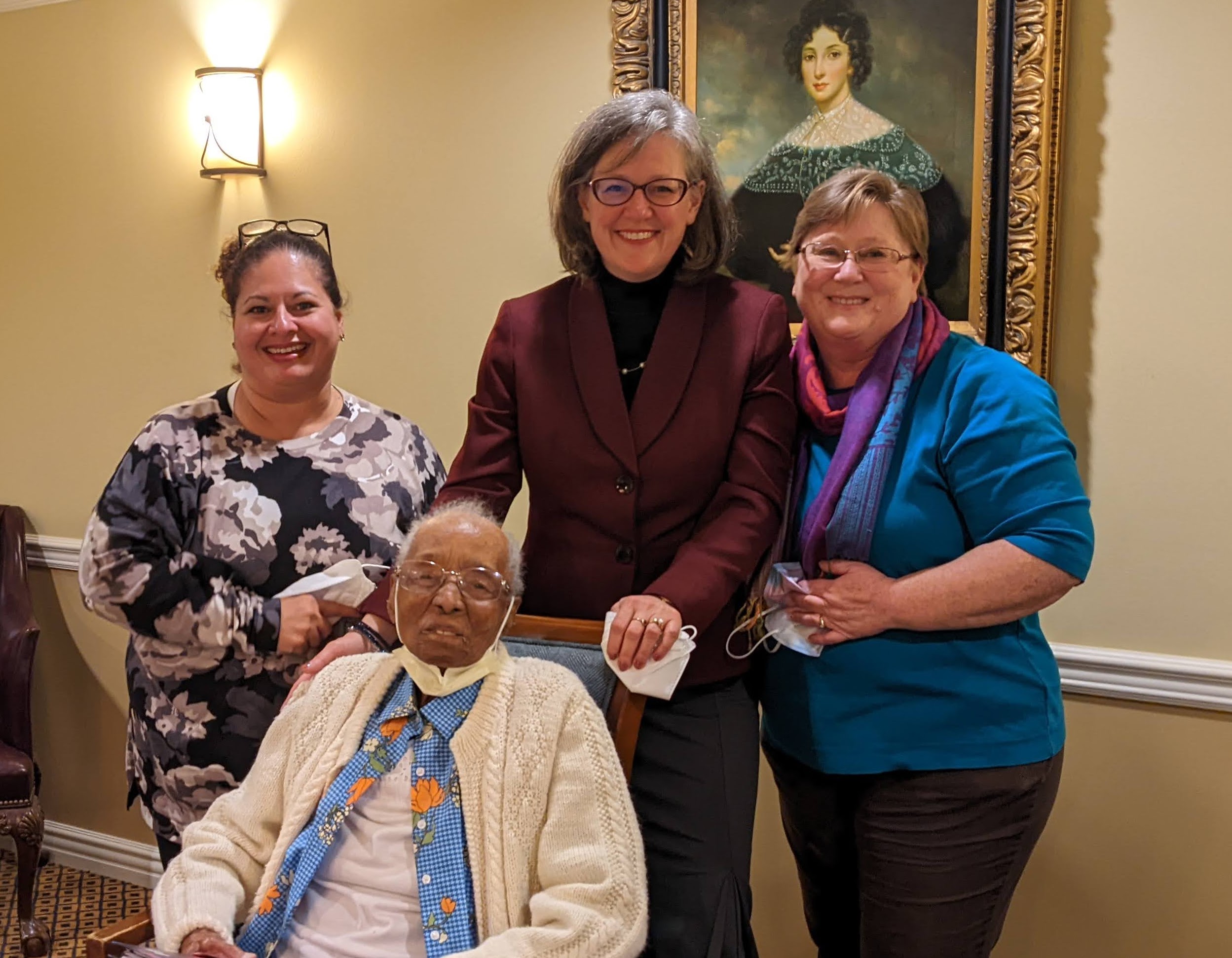 Photos from 2021-2022 capture some of the wonderful moments we had with Edith: celebrating the rededication of the Smith Student Art Gallery (fall of 2021), interviewing her at her home in Chicago (summer 2022), sharing the news of Renfrow Hall with her (October 2022) induction into the GHS Alumni Hall of Fame and the public announcement of Renfrow Hall by the college (December 2022). It is remarkable to think that she is 107 or 108 years old in all of these photos!